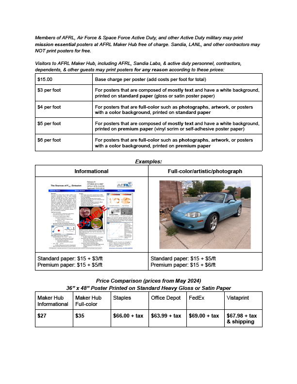 The Maker Hub allows poster printing for Work related projects only. We can accommodate up to 12.5 feet of printing per week for work projects, if you would like to use the poster for personal use you will have you provide your own ink and paper, please see a tech to show you what your choices are.